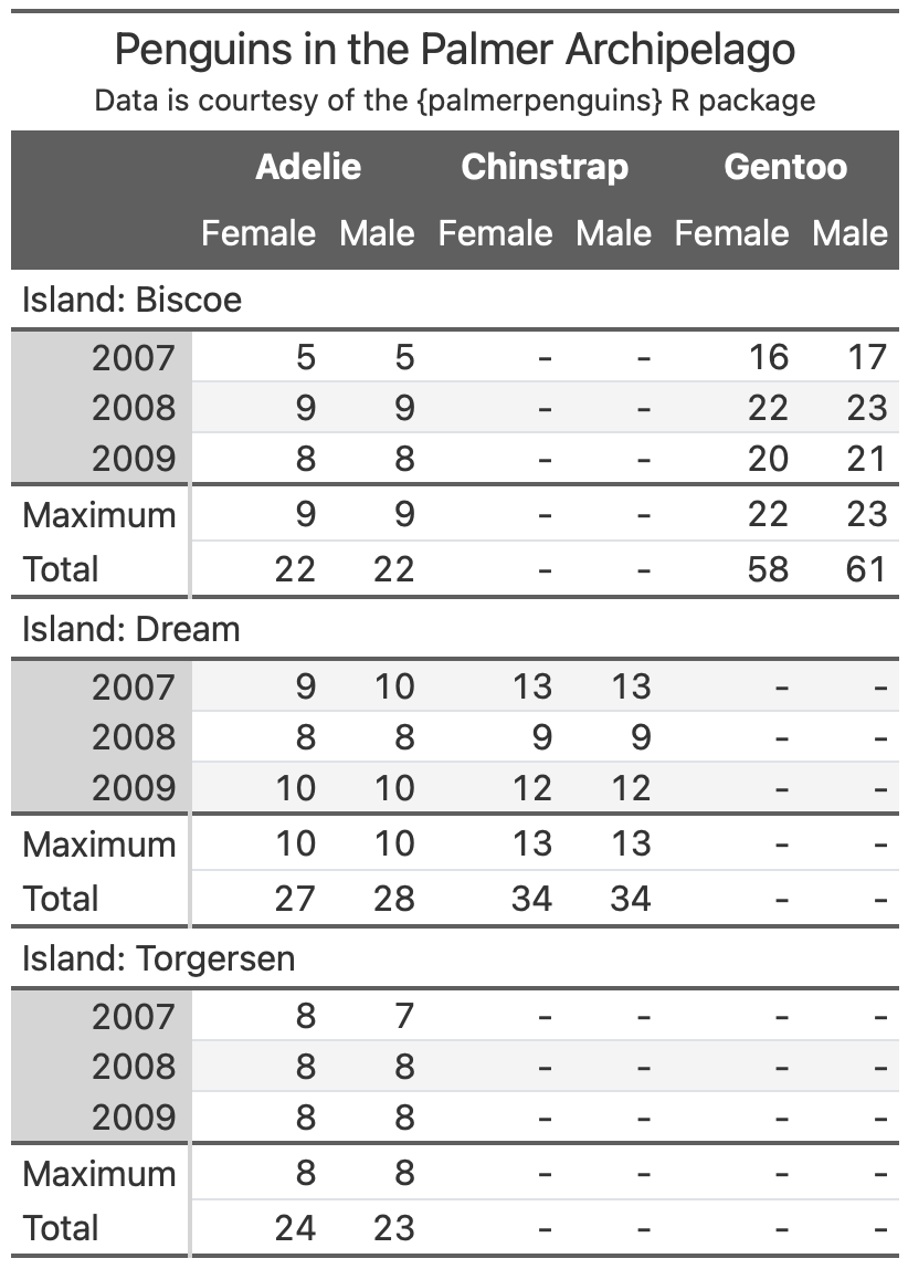 How good can you get it looking? You can consult the reference section on the {gt} website to see all the options available.