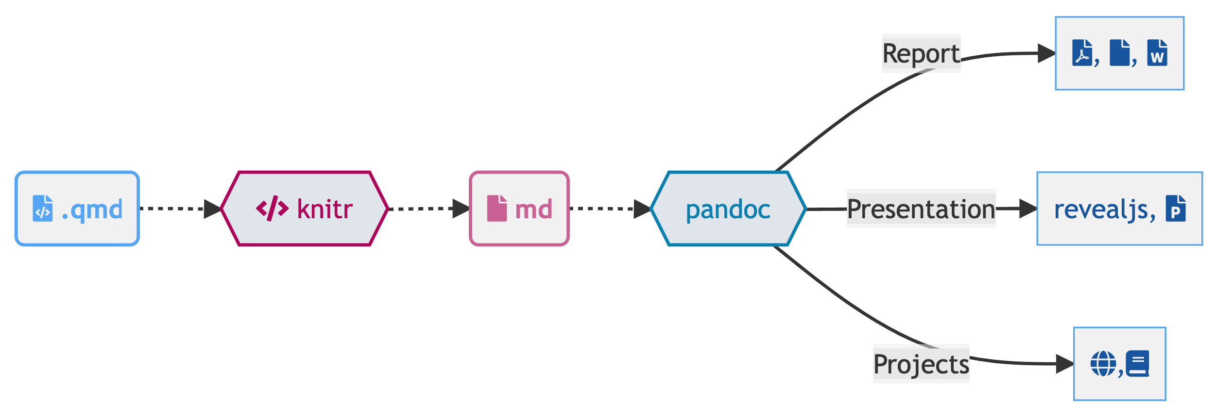 .qmd,.rmd,.md) OR mixed formats (.ipynb/Jupyter notebook) into static PDF/Word/HTML reports, books, websites, presentations and more